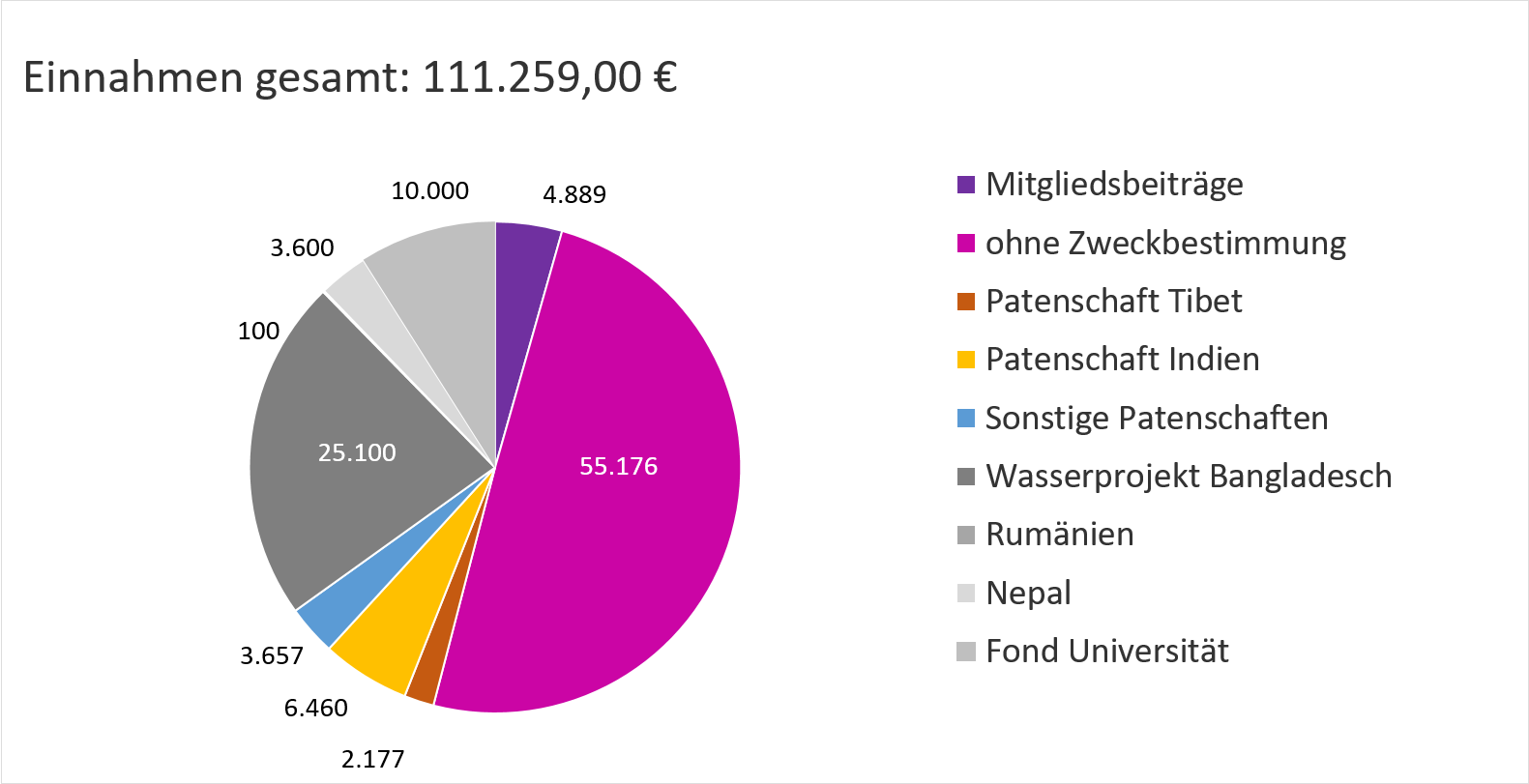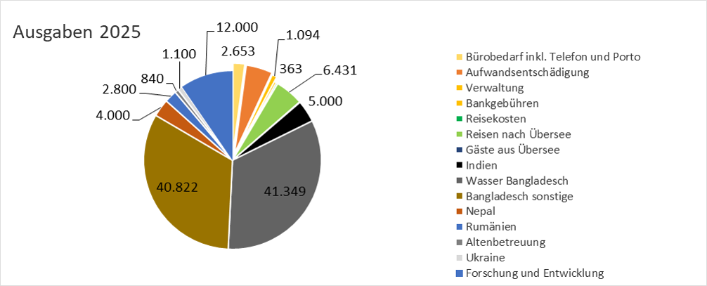Ein erheblicher Teil der Einnahmen wurde 2025 für Bangladesch verwendet - insbesondere sachgebundene Drittmittel. Das sind wie bisher die Projekte für sauberes Trinkwasser, aber auch neue Projekte, die der Nahrungssicherung und dem Klimaschutz dienen. Daneben haben wir auch tolle Projekte in Nepal und Indien umgesetzt. Bedingt durch die Drittmittelprojekte fielen dieses Jahr viele Kosten für Forschung und Reisen an. Wie in den letzten Jahren konnte der Anteil der Verwaltungskosten mit 3 % und der Personalkosten in Deutschland mit 5 % sehr niedrig gehalten werden. Mit wenigen Ausnahmen, d.h. für die Bearbeitung von Drittmittelprojekten, die sehr viel Zeit erfordern, arbeiten wir in Deutschland vollständig ehrenamtlich. Denn manchmal ist das sehr viel - neben der regulären Berufstätigkeit aller Ehrenamtlichen - aber es macht sehr großen Spaß. Wir danken für Ihr Vertrauen!